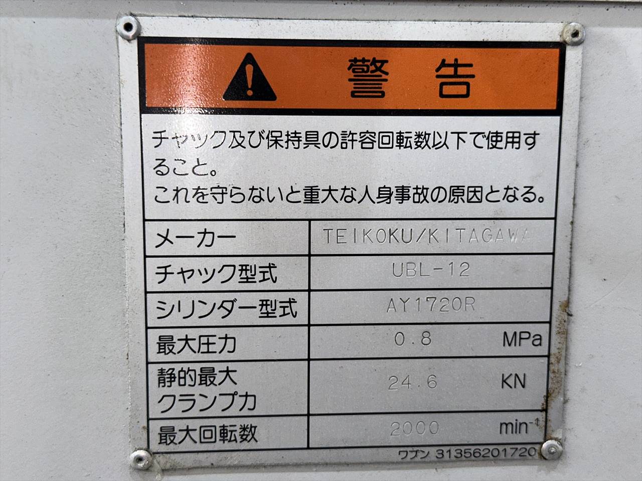 チャックサイス゛:無し(標準は10インチです。12インチエアーチャックが付いていましたが、特殊仕様で他の機械に転用しました。回転シリ