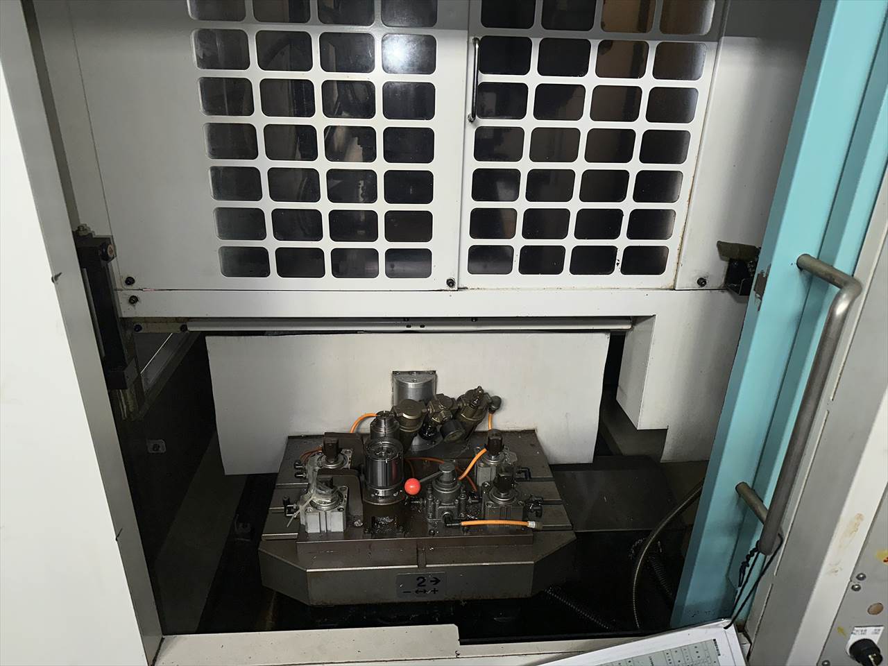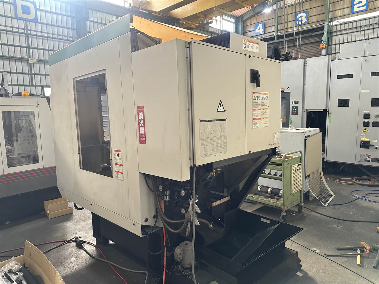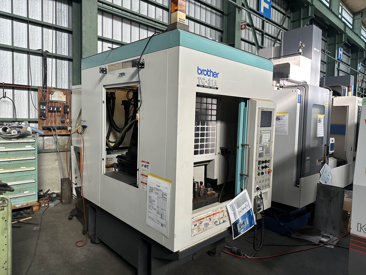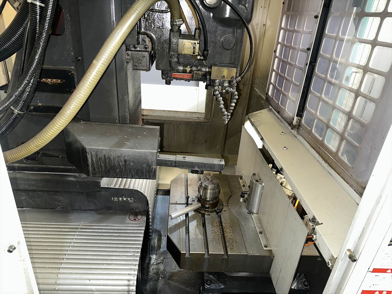 ○特徴  ATC26本(ダブルアーム方式) クイックテーブル仕様(2面パレットチェンジャー)  主軸交換済み(メーカー) ○NC装置  CNC-A00 ○移動量  X軸(コラム左右)350×Y軸(コラム前後)250×Z軸(主軸頭上下)350mm  テーブル上面から主軸端面までの距離200~550mm ○テーブル  作業面の大きさ:500×270mm×2APC(最大積載質量80㎏片面) ○主軸  主軸回転速度:16~16000rpm タップ加工時主軸回転速度:MAX6000rpm  主軸テーパ穴:7/24テーパ№30 ○送り速度  早送り速度:X軸50×Y軸50×Z軸50m/min  切削送り速度:1~20000mm/min ○工具交換装置  ツールシャンク形式:MAS.BT30 プルスタッド形式:MAS.P30T-2  工具収納本数:ATC26本 工具最大長さ200mm  工具最大径:φ55mm(大径工具φ125mm)  工具最大質量:3.5㎏(総質量55㎏/26本)  工具選択方式:メモリーランダム  工具交換時間:T-T0.7sec/C-C2.0sec ○モータ  主軸用(10分/連続):8.4/4.9kw 送り軸用:1.2kw(X・Y・Z軸) ○所要動力源  電源容量:9(最大20)kVA 空気圧源:0.4~0.6MPa×流量100(大気圧)L/min ○機械の大きさ  幅1410×奥行2903(配電盤扉開口時)×高さ2225mm 機械質量:2100kg