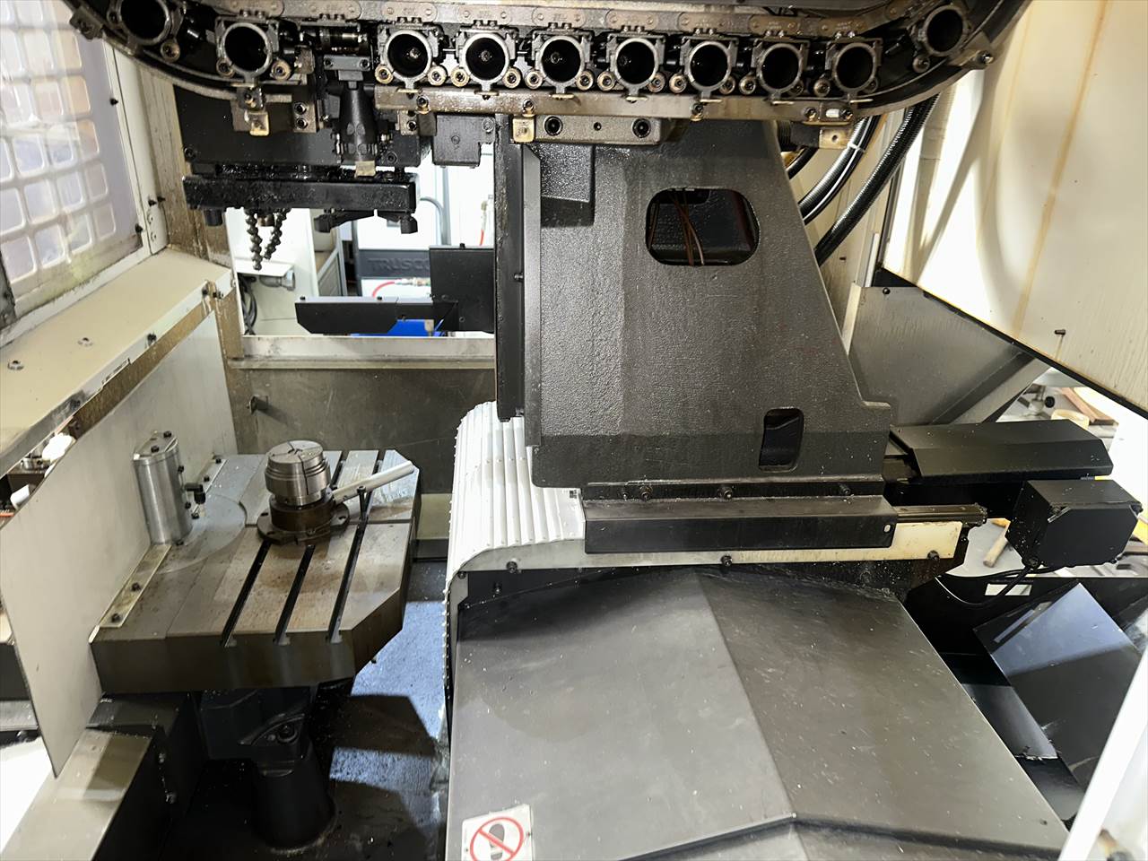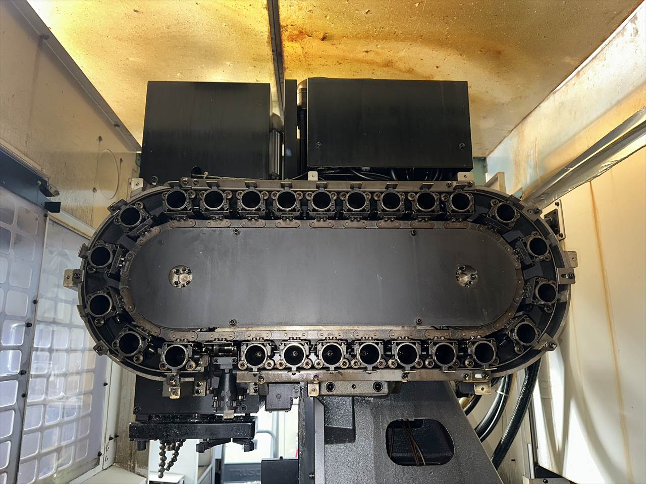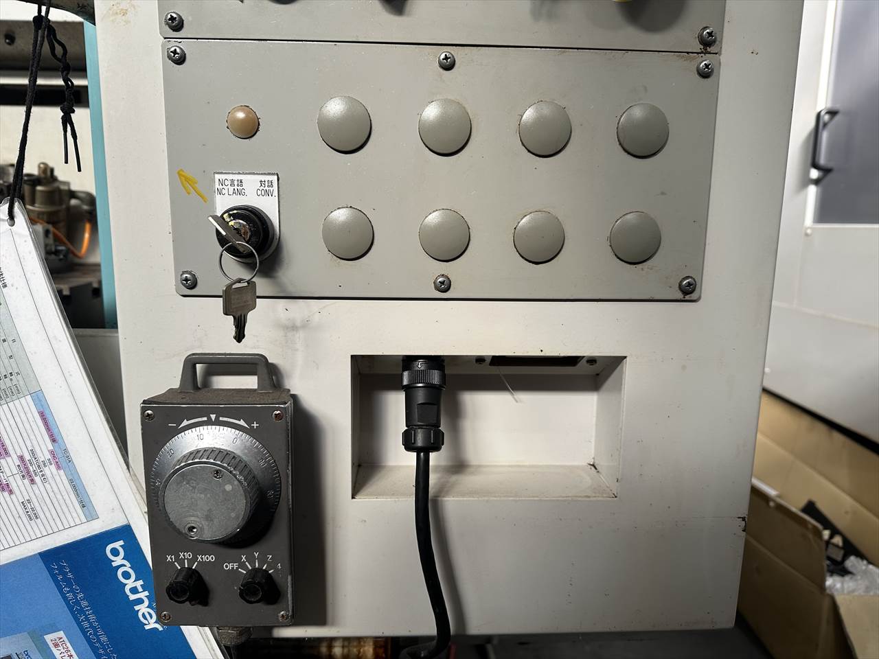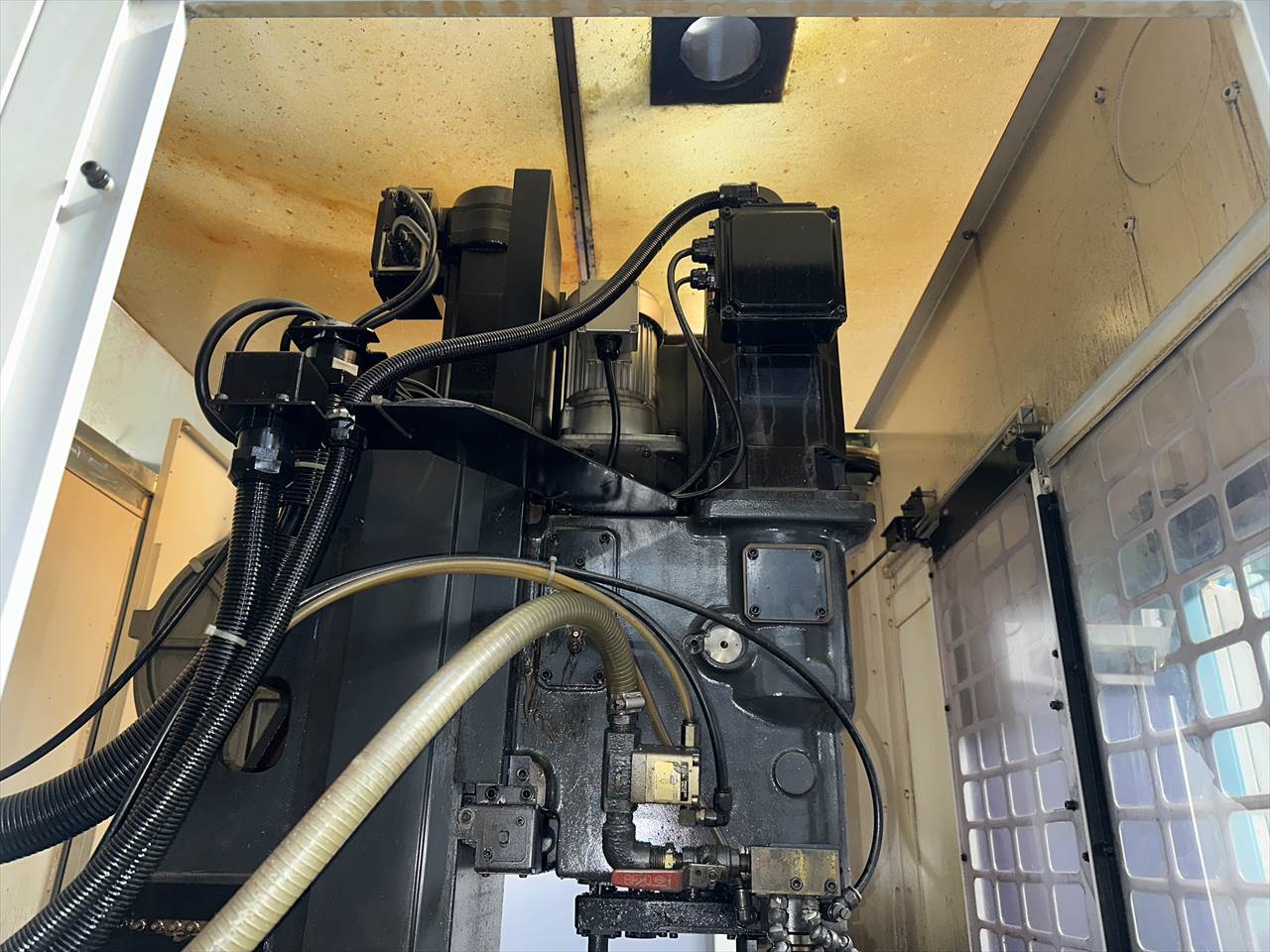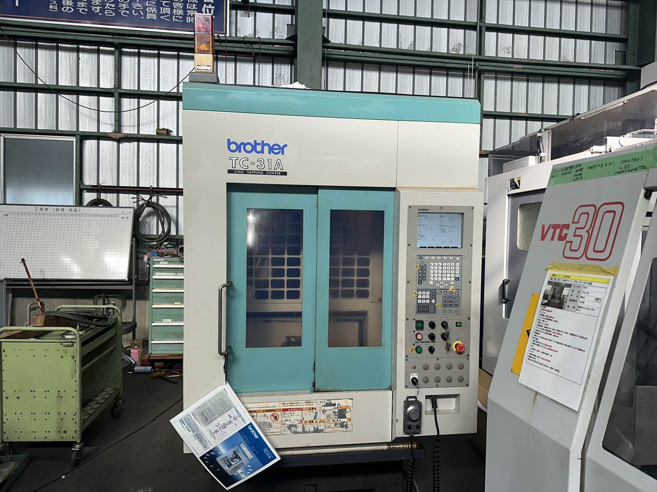 ○特徴  ATC26本(ダブルアーム方式) クイックテーブル仕様(2面パレットチェンジャー)  主軸交換済み(メーカー) ○NC装置  CNC-A00 ○移動量  X軸(コラム左右)350×Y軸(コラム前後)250×Z軸(主軸頭上下)350mm  テーブル上面から主軸端面までの距離200~550mm ○テーブル  作業面の大きさ:500×270mm×2APC(最大積載質量80㎏片面) ○主軸  主軸回転速度:16~16000rpm タップ加工時主軸回転速度:MAX6000rpm  主軸テーパ穴:7/24テーパ№30 ○送り速度  早送り速度:X軸50×Y軸50×Z軸50m/min  切削送り速度:1~20000mm/min ○工具交換装置  ツールシャンク形式:MAS.BT30 プルスタッド形式:MAS.P30T-2  工具収納本数:ATC26本 工具最大長さ200mm  工具最大径:φ55mm(大径工具φ125mm)  工具最大質量:3.5㎏(総質量55㎏/26本)  工具選択方式:メモリーランダム  工具交換時間:T-T0.7sec/C-C2.0sec ○モータ  主軸用(10分/連続):8.4/4.9kw 送り軸用:1.2kw(X・Y・Z軸) ○所要動力源  電源容量:9(最大20)kVA 空気圧源:0.4~0.6MPa×流量100(大気圧)L/min ○機械の大きさ  幅1410×奥行2903(配電盤扉開口時)×高さ2225mm 機械質量:2100kg