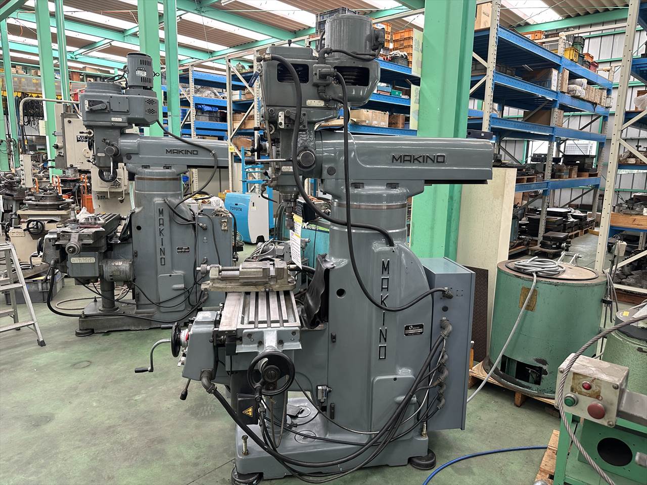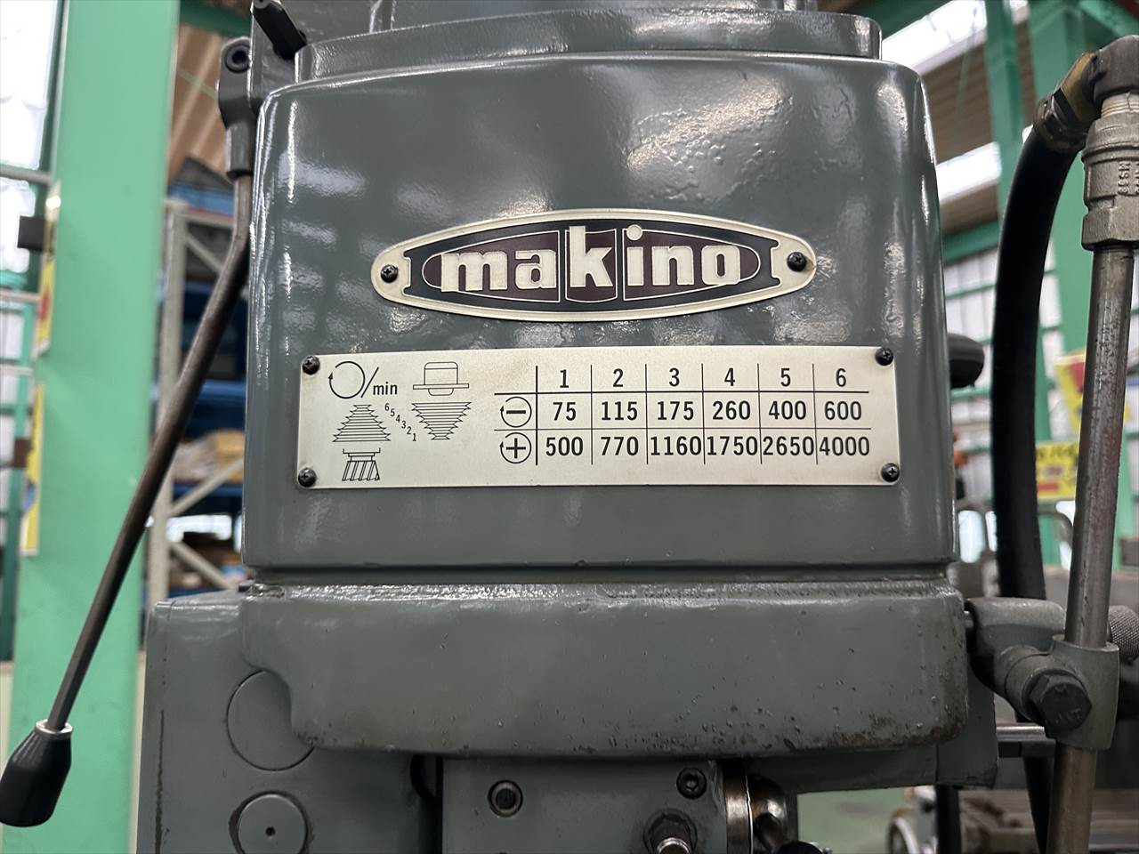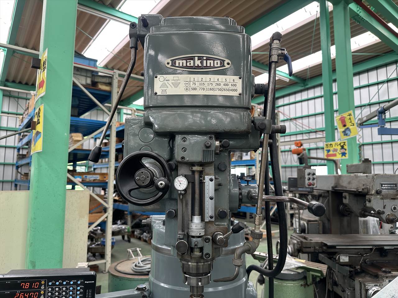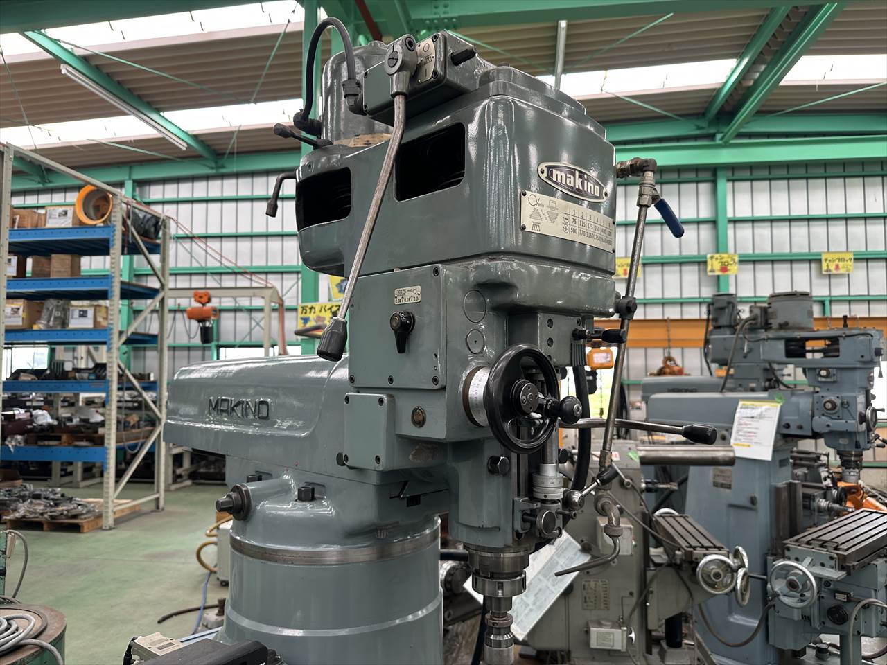 主軸穴のテーパ:№40 主軸回転数:75~4000rpm(ベルト掛け替え12段) 主軸頭旋回角度:左右±45°