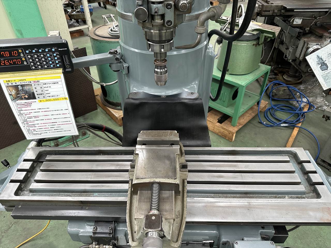 テーブル:左右550×前後250mm×上下350mm 主軸クイル送り量:100mm オーバーアーム前後動き:300mm