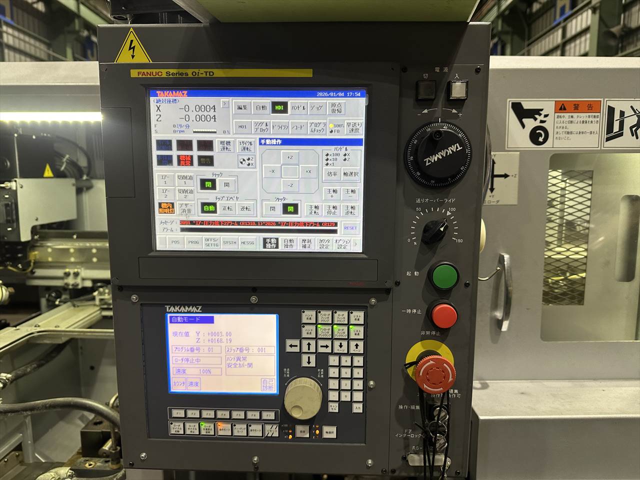 ○特徴  実働1年 程度極上 ワーク搬入装置付  2台セット販売も可能です。  U47047 NC旋盤(クシ刃型)_高松_USL-480_2015年_No.1360057  U47048 NC旋盤(クシ刃型)_高松_USL-480_2015年_No.1360058  省スペース 高精度加工 サイクルタイム短縮 ○NC装置  TAKAMAZ & FANUC 0i-TD ○能力  適正加工径:φ40×50mm ○主軸  チャックサイズ:コレット、3インチ 主軸軸受内径:φ50mm  主軸回転速度:MAX10000rpm ○刃物台  刃物台形状:くし形(ツール4本) 最大移動量:X軸160 Z軸200mm  早送り速度:X軸12 Z軸15m/min ○モータ  主軸モータ:AC5.5/3.7kw 送りモータ:X軸AC0.5 Z軸AC0.5kw ○機械の大きさ  幅480×奥行1941mm×高さ1650mm 質量1000㎏ ○ローダー搬送能力  型式:ΣiU30(3方爪ハンド) ワーク寸法:径MAXφ30mm 質量(片側)0.3㎏  ショルダ(走行軸):駆動方式サーボモータ ストローク645mm 早送り速度70m/min  アーム(上下軸):駆動方式サーボモータ ストローク260mm 早送り速度60m/min  ハンド旋廻:駆動方式エアシリンダ 角度90°  搬送ワーク長さ(参考値):40mm 最大可搬重量:0.3㎏  早送り速度:Y軸60 Z軸70m/min