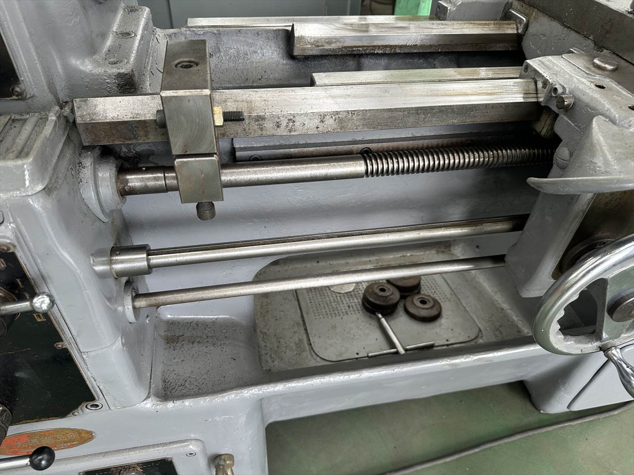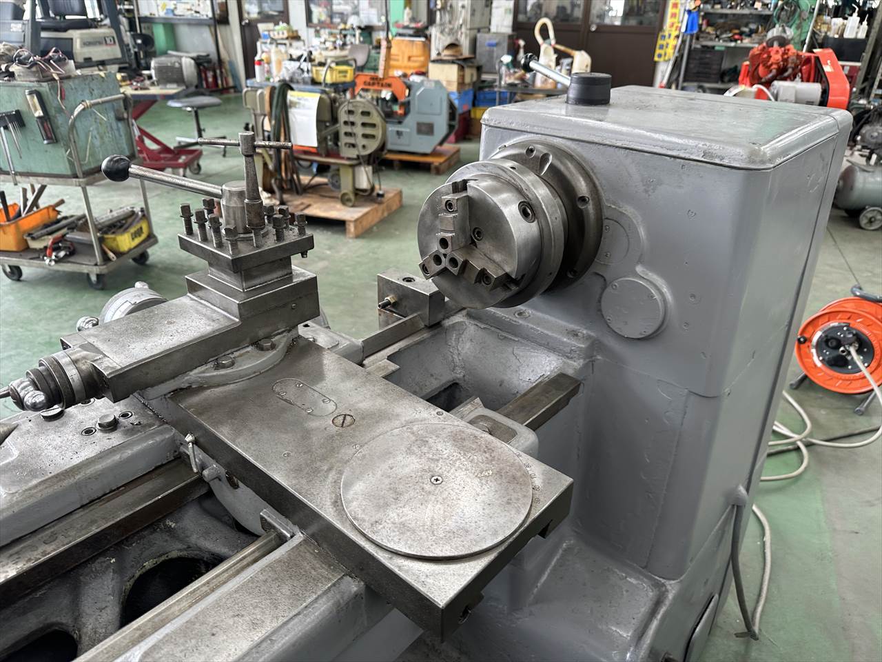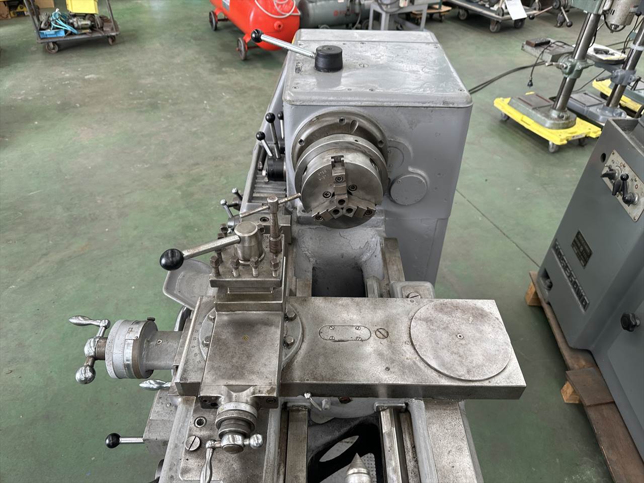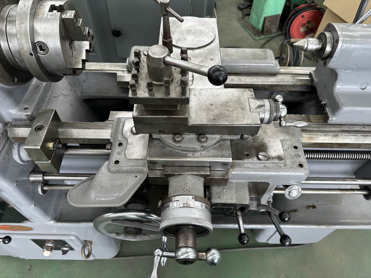 ○特徴  足踏みブレーキは有りません。  小型機ながら主軸回転数は60~2400rpm(12段)です。 ○容量  ベッド上の振り:φ350mm  横送り台上の振り:φ190mm  横送り台最大移動距離:200mm  上部刃物台最大移動距離:100mm  両センター間の最大距離:582mm ○主軸  φ160mm3爪スクロールチャック(φ190に交換できます。)  主軸回転数:60~2400rpm(12段)  主軸穴径:φ39mm  主軸穴のテーパ:M.T.№5 ○送り歯車箱  自動送りの範囲:0.05~0.7mm/rev(32段)  ネジ切りの範囲:ピッチ0.5~7mm ○心押し台  心押し軸の最大蔚号距離:120mm  センターのテーパ:M.T.№3 ○ベッド  長さ1415×幅300mm ○モータ  3.7kw ○機械の大きさ  幅1700×奥行930mm 重量1220㎏
