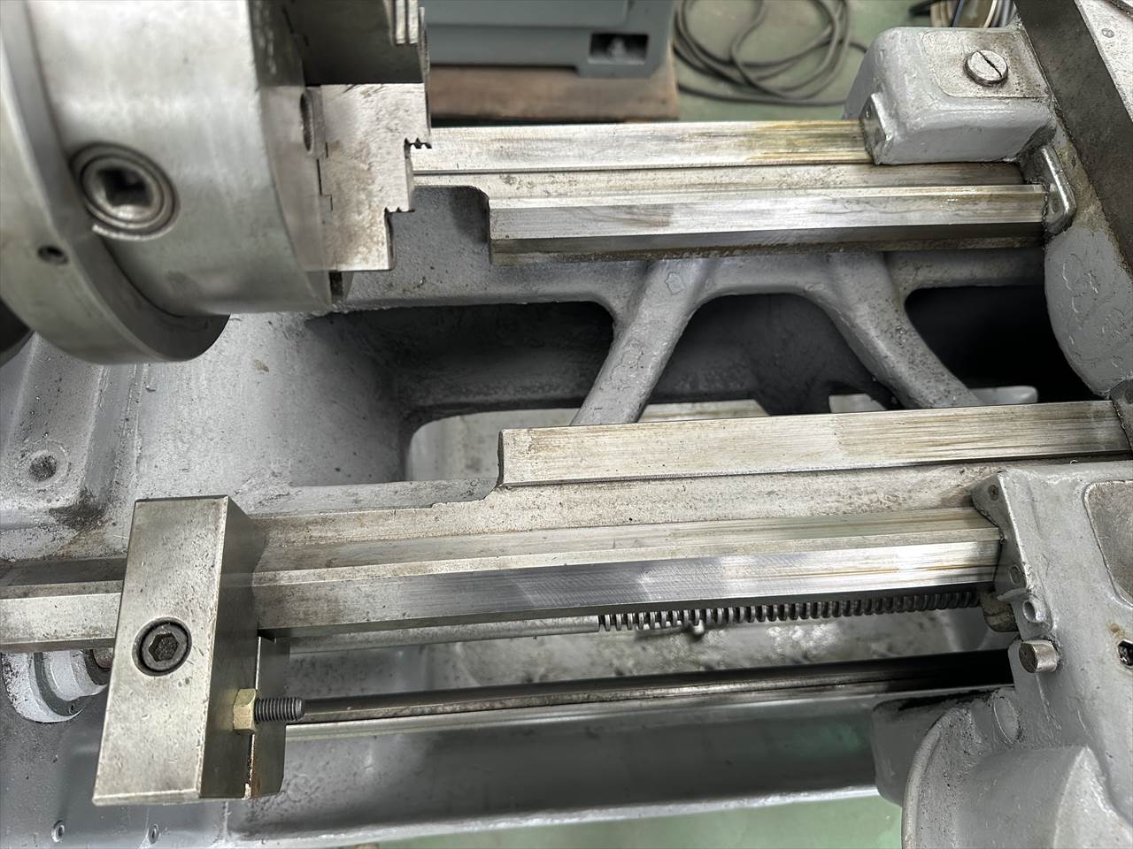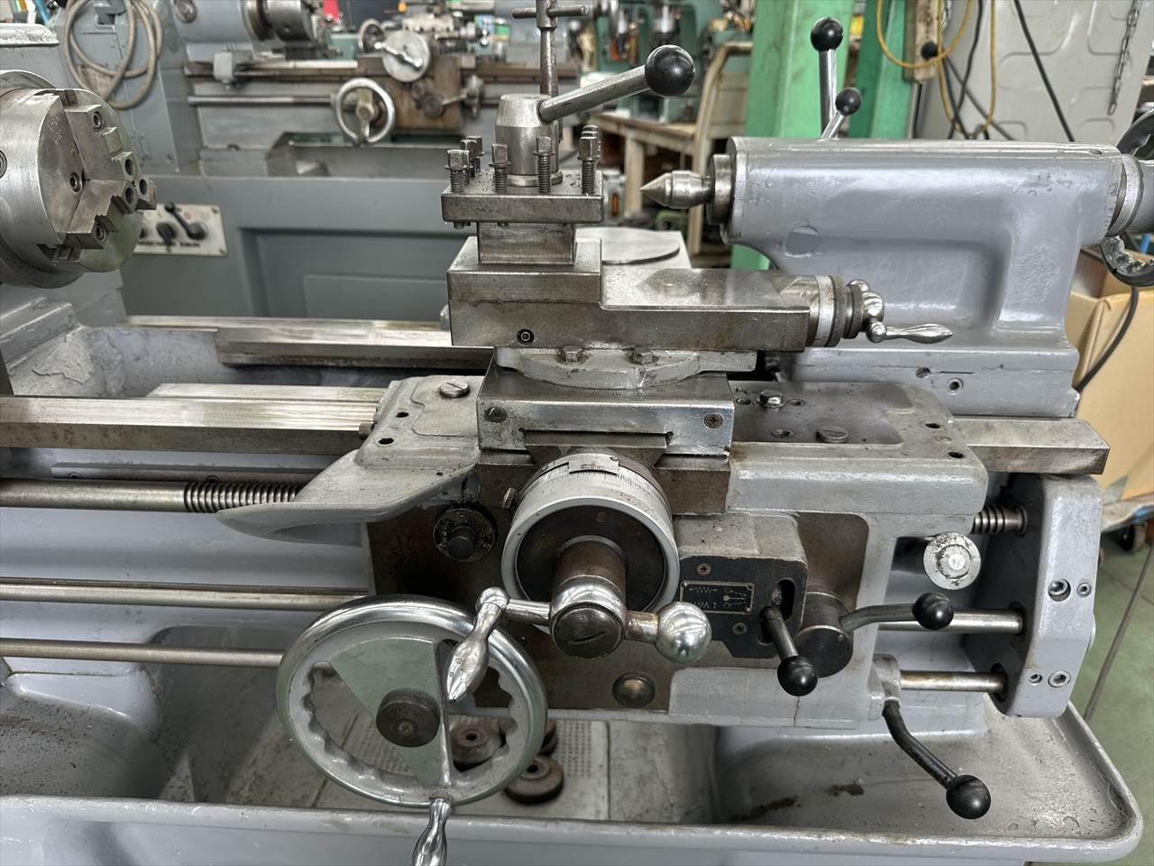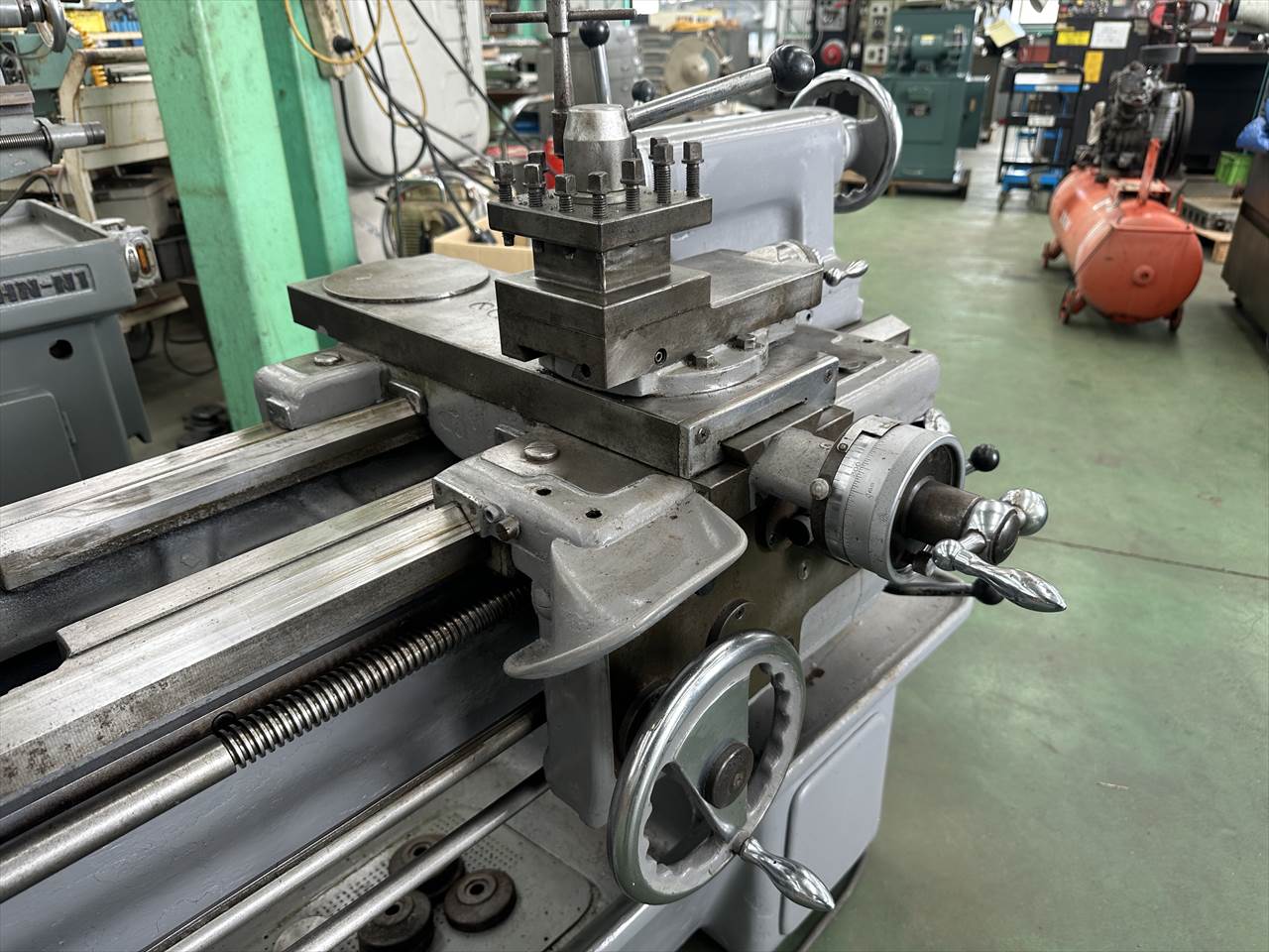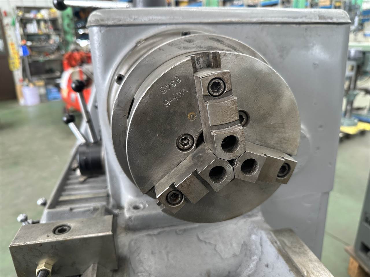 ○特徴  足踏みブレーキは有りません。  小型機ながら主軸回転数は60~2400rpm(12段)です。 ○容量  ベッド上の振り:φ350mm  横送り台上の振り:φ190mm  横送り台最大移動距離:200mm  上部刃物台最大移動距離:100mm  両センター間の最大距離:582mm ○主軸  φ160mm3爪スクロールチャック(φ190に交換できます。)  主軸回転数:60~2400rpm(12段)  主軸穴径:φ39mm  主軸穴のテーパ:M.T.№5 ○送り歯車箱  自動送りの範囲:0.05~0.7mm/rev(32段)  ネジ切りの範囲:ピッチ0.5~7mm ○心押し台  心押し軸の最大蔚号距離:120mm  センターのテーパ:M.T.№3 ○ベッド  長さ1415×幅300mm ○モータ  3.7kw ○機械の大きさ  幅1700×奥行930mm 重量1220㎏