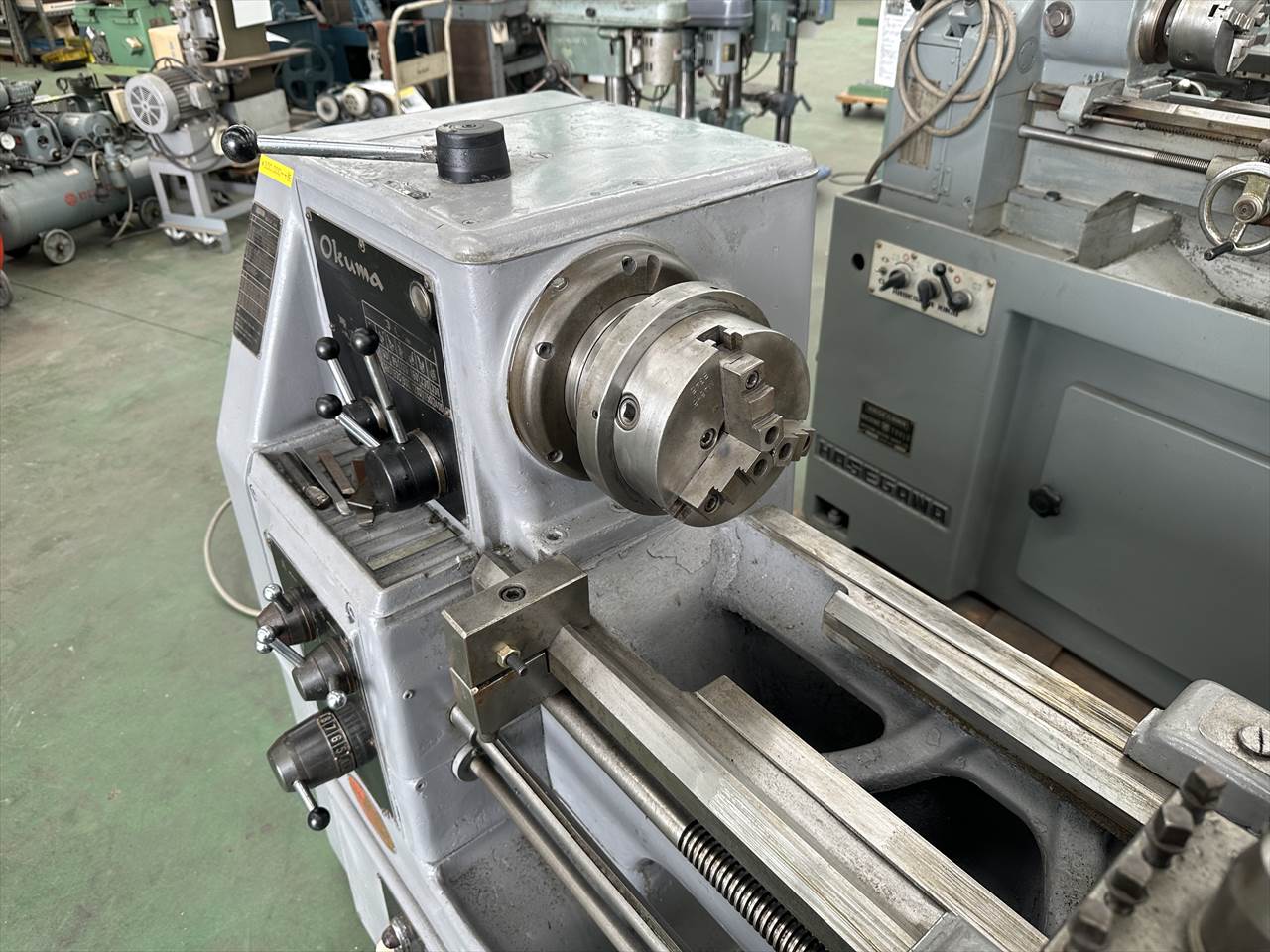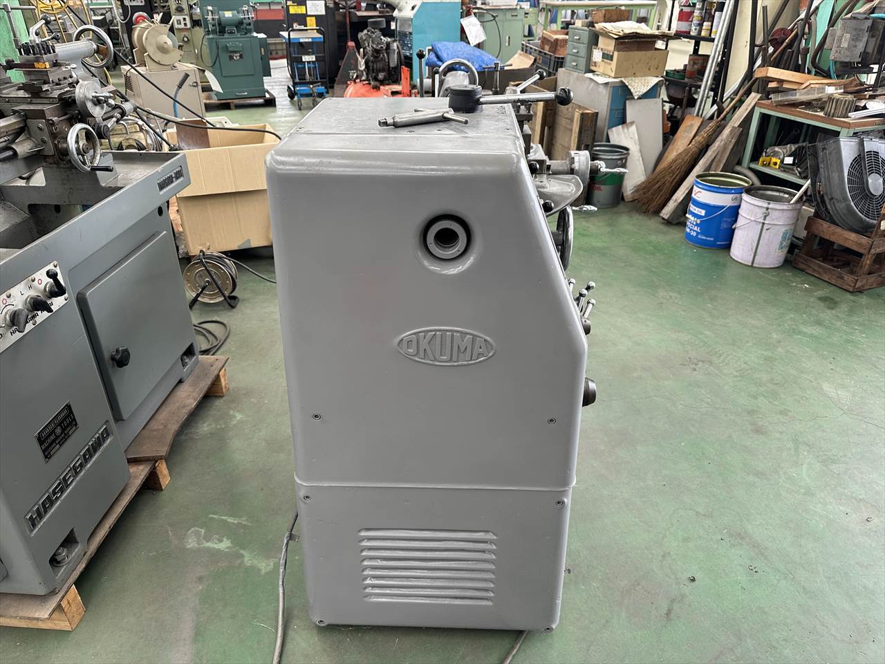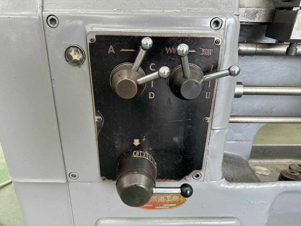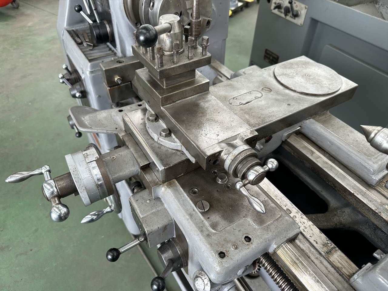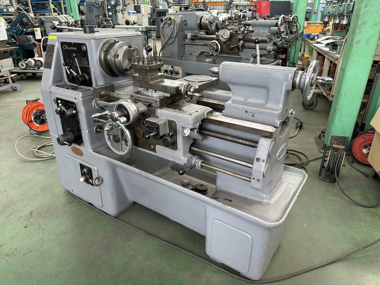 ○特徴  足踏みブレーキは有りません。  小型機ながら主軸回転数は60~2400rpm(12段)です。 ○容量  ベッド上の振り:φ350mm  横送り台上の振り:φ190mm  横送り台最大移動距離:200mm  上部刃物台最大移動距離:100mm  両センター間の最大距離:582mm ○主軸  φ160mm3爪スクロールチャック(φ190に交換できます。)  主軸回転数:60~2400rpm(12段)  主軸穴径:φ39mm  主軸穴のテーパ:M.T.№5 ○送り歯車箱  自動送りの範囲:0.05~0.7mm/rev(32段)  ネジ切りの範囲:ピッチ0.5~7mm ○心押し台  心押し軸の最大蔚号距離:120mm  センターのテーパ:M.T.№3 ○ベッド  長さ1415×幅300mm ○モータ  3.7kw ○機械の大きさ  幅1700×奥行930mm 重量1220㎏