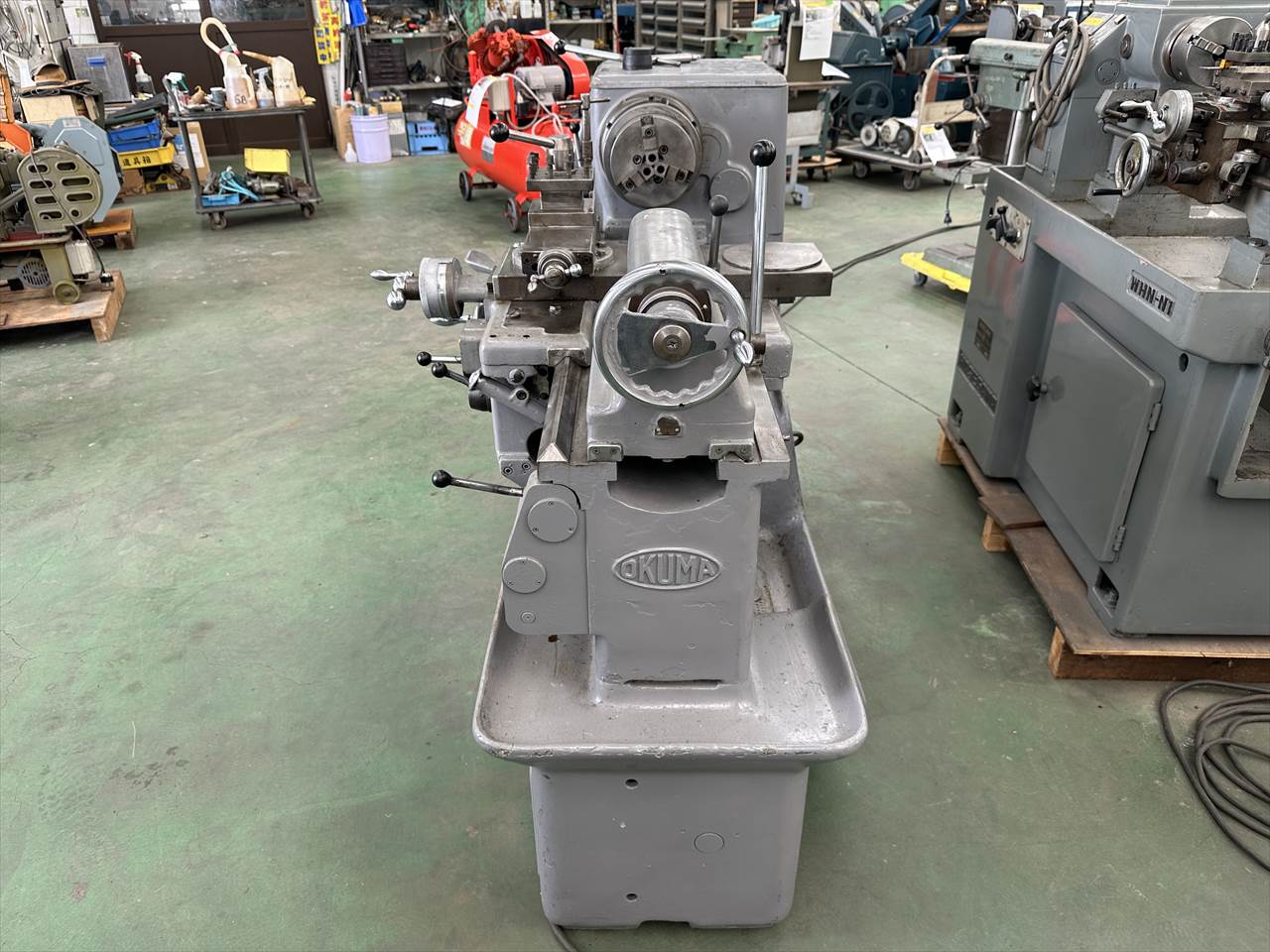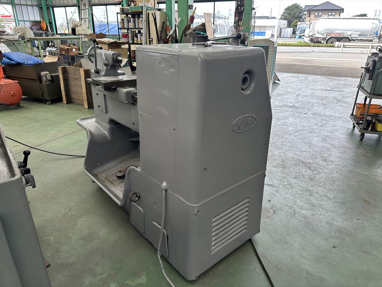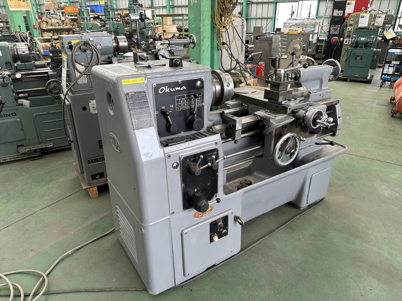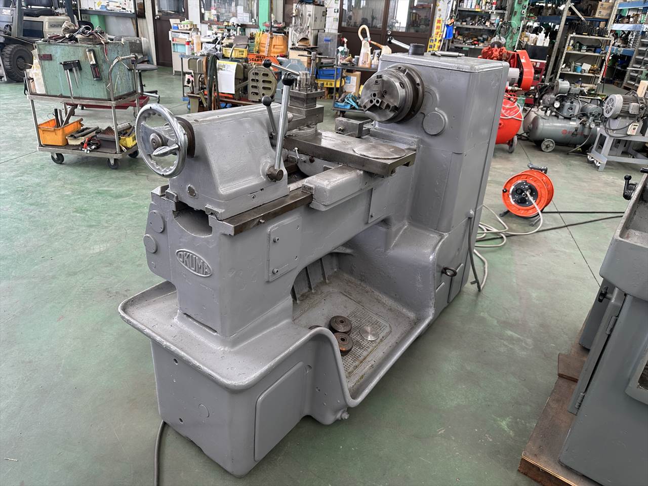 ○特徴  足踏みブレーキは有りません。  小型機ながら主軸回転数は60~2400rpm(12段)です。 ○容量  ベッド上の振り:φ350mm  横送り台上の振り:φ190mm  横送り台最大移動距離:200mm  上部刃物台最大移動距離:100mm  両センター間の最大距離:582mm ○主軸  φ160mm3爪スクロールチャック(φ190に交換できます。)  主軸回転数:60~2400rpm(12段)  主軸穴径:φ39mm  主軸穴のテーパ:M.T.№5 ○送り歯車箱  自動送りの範囲:0.05~0.7mm/rev(32段)  ネジ切りの範囲:ピッチ0.5~7mm ○心押し台  心押し軸の最大蔚号距離:120mm  センターのテーパ:M.T.№3 ○ベッド  長さ1415×幅300mm ○モータ  3.7kw ○機械の大きさ  幅1700×奥行930mm 重量1220㎏