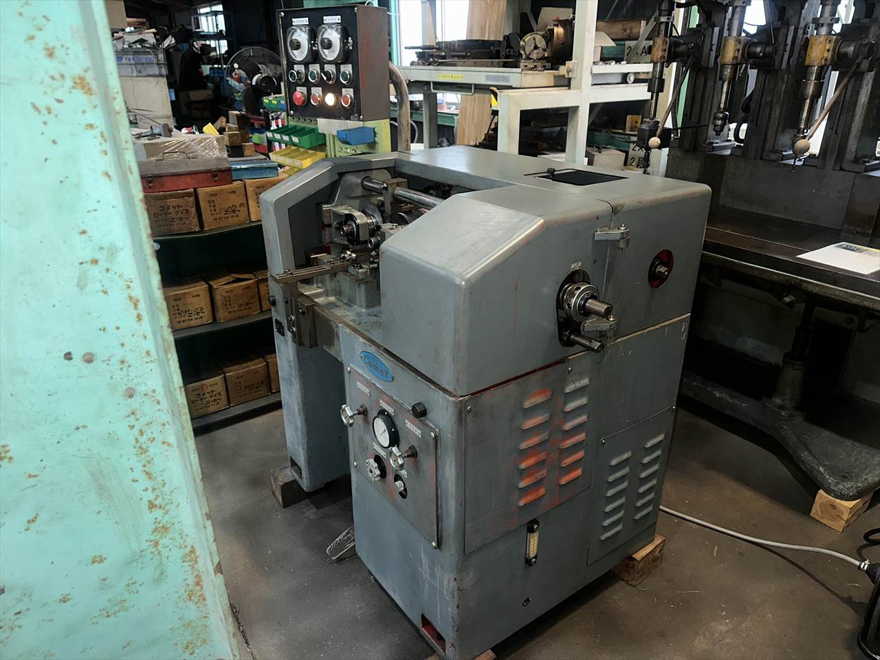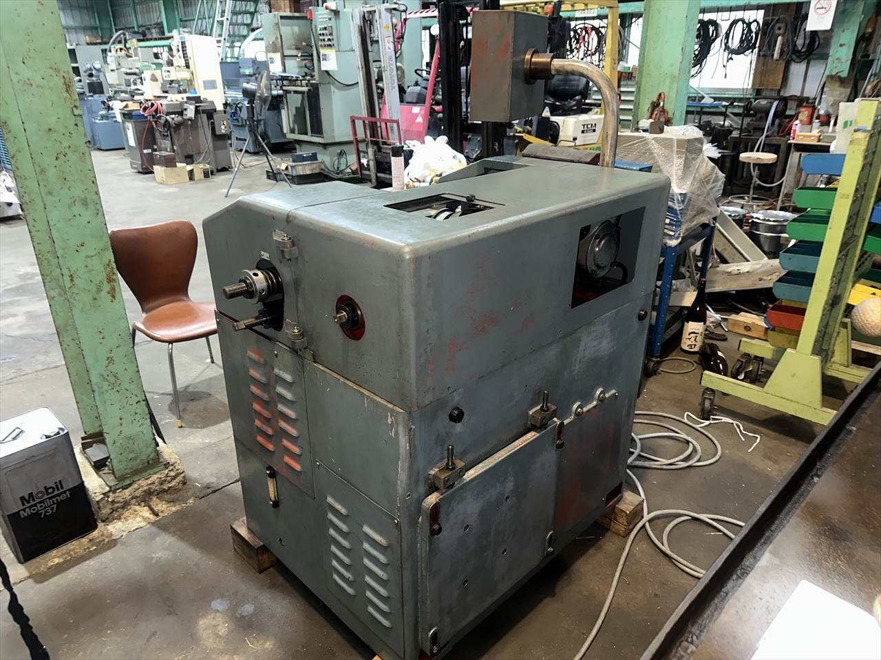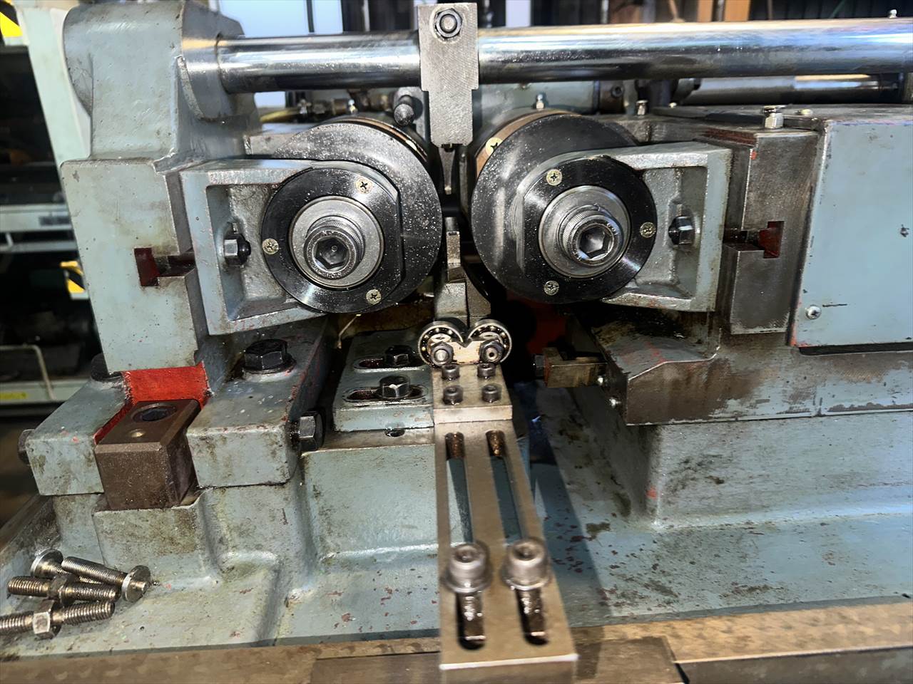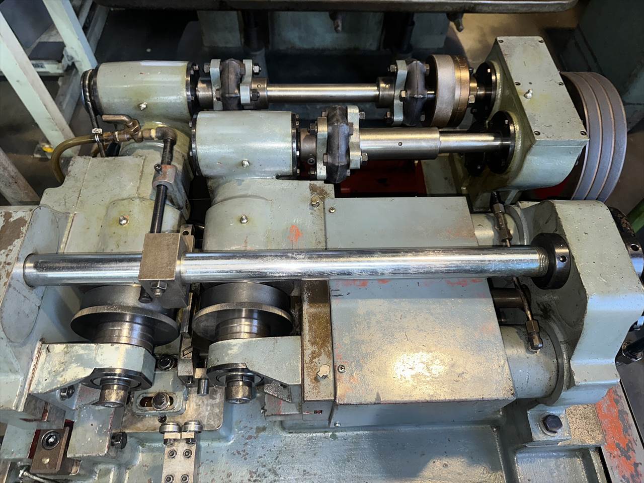 ○転造しうる雄ねじ  最大外径:φ35mm 1+3/8インチ 最少外径:φ3mm 1/8インチ  長さ:75mm ピッチ:0.5~2.5mm 32~10T.P.1 ○ロールダイス  回転数:40、60rpm  最大外径:φ158mm  孔径:φ54mm  幅:40~80mm  主軸間の最大距離:180mm  主軸間の最小距離:125mm(ストッパーなしの時) ○転造力  最大転造圧力  6000㎏ ○モータ  主軸駆動:2.2kw 油圧ポンプ:0.75kw ○機械の大きさ  床面から主軸芯までの高さ:850mm  所要床面積:間口1120×奥行850×高さ1440mm 重量1100㎏ ※ただし、抗張力80㎏/mm2以上の材質の場合には、この項の最大値はとれません。 ○付属品  ダイス  ①ローレットダイス ②M3×0.5(未使用) ③M4×0.7(未使用)  ④M5×0.8(未使用) ⑤M6×1.0 ⑥M8×1.25 ⑦M10×1.5  ⑧M12×1.75(未使用) ⑨M18×2.5(未使用)  支持刃  10-20-30-40-50-80  足踏みスイッチ 専用工具箱