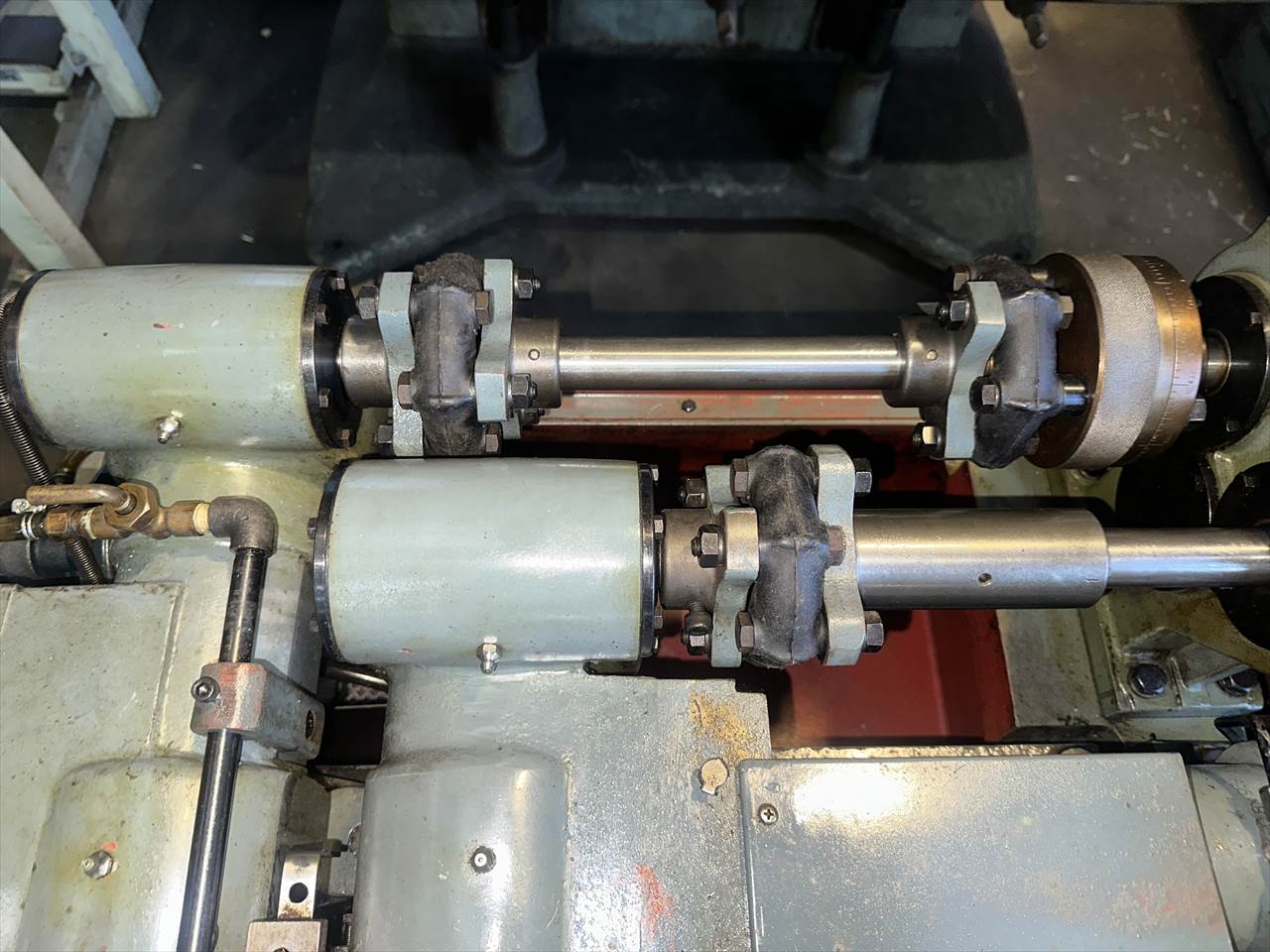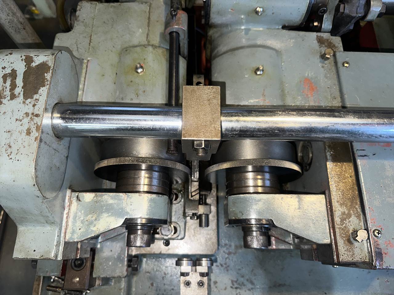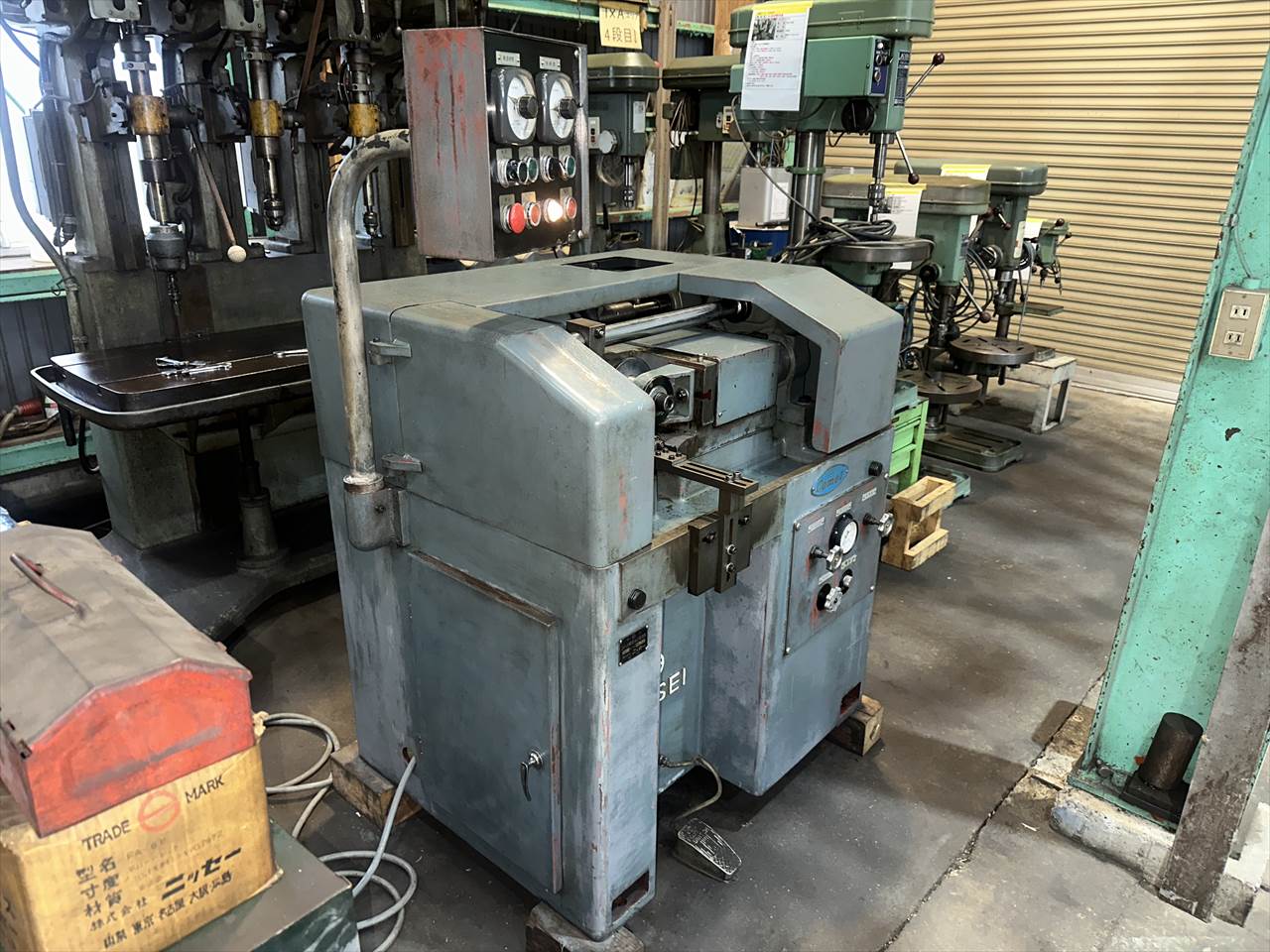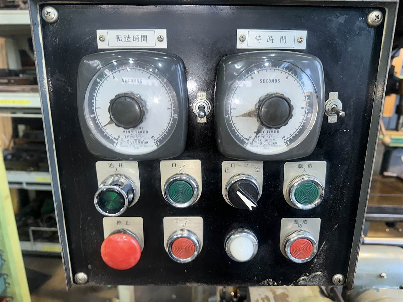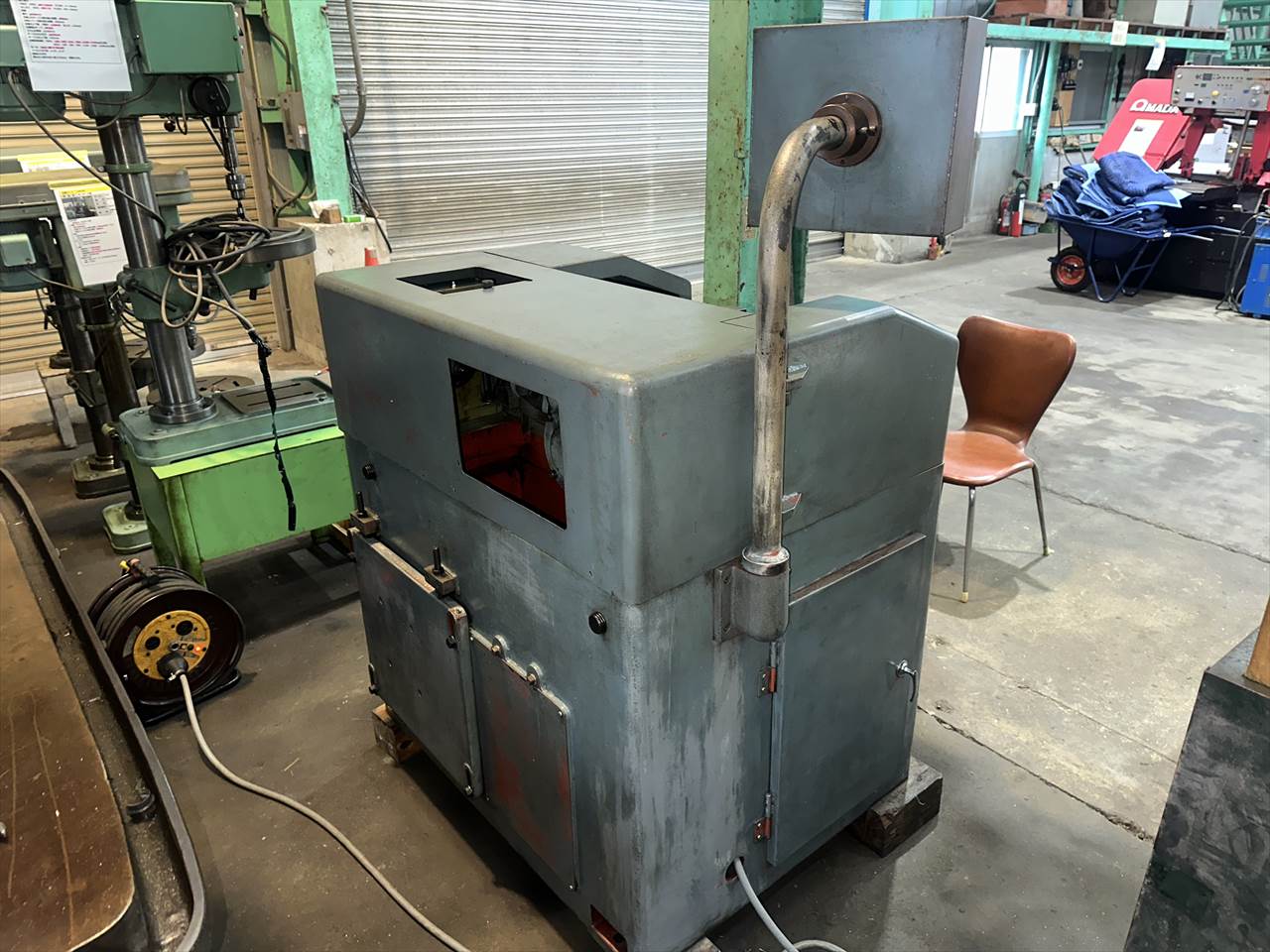 ○転造しうる雄ねじ  最大外径:φ35mm 1+3/8インチ 最少外径:φ3mm 1/8インチ  長さ:75mm ピッチ:0.5~2.5mm 32~10T.P.1 ○ロールダイス  回転数:40、60rpm  最大外径:φ158mm  孔径:φ54mm  幅:40~80mm  主軸間の最大距離:180mm  主軸間の最小距離:125mm(ストッパーなしの時) ○転造力  最大転造圧力  6000㎏ ○モータ  主軸駆動:2.2kw 油圧ポンプ:0.75kw ○機械の大きさ  床面から主軸芯までの高さ:850mm  所要床面積:間口1120×奥行850×高さ1440mm 重量1100㎏ ※ただし、抗張力80㎏/mm2以上の材質の場合には、この項の最大値はとれません。 ○付属品  ダイス  ①ローレットダイス ②M3×0.5(未使用) ③M4×0.7(未使用)  ④M5×0.8(未使用) ⑤M6×1.0 ⑥M8×1.25 ⑦M10×1.5  ⑧M12×1.75(未使用) ⑨M18×2.5(未使用)  支持刃  10-20-30-40-50-80  足踏みスイッチ 専用工具箱