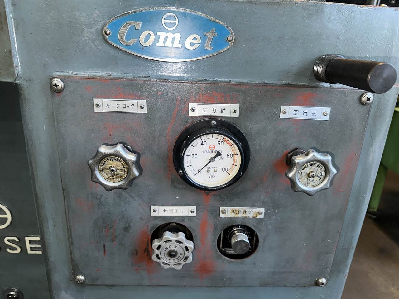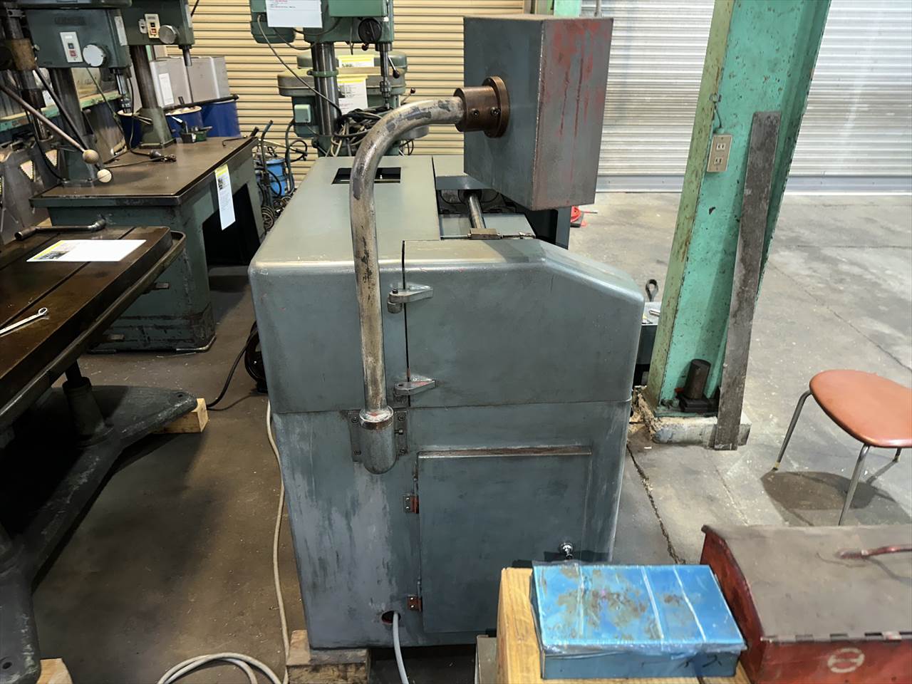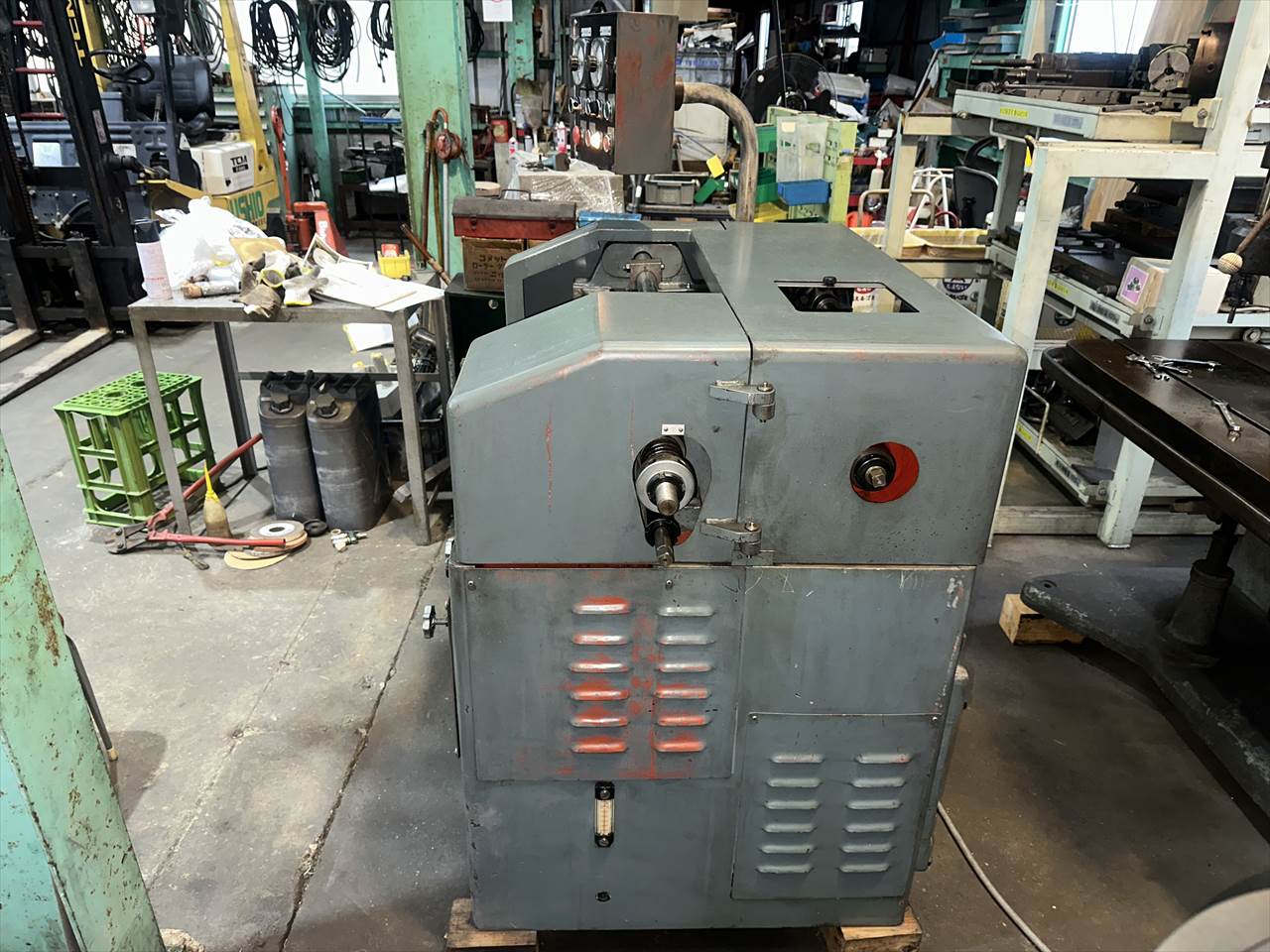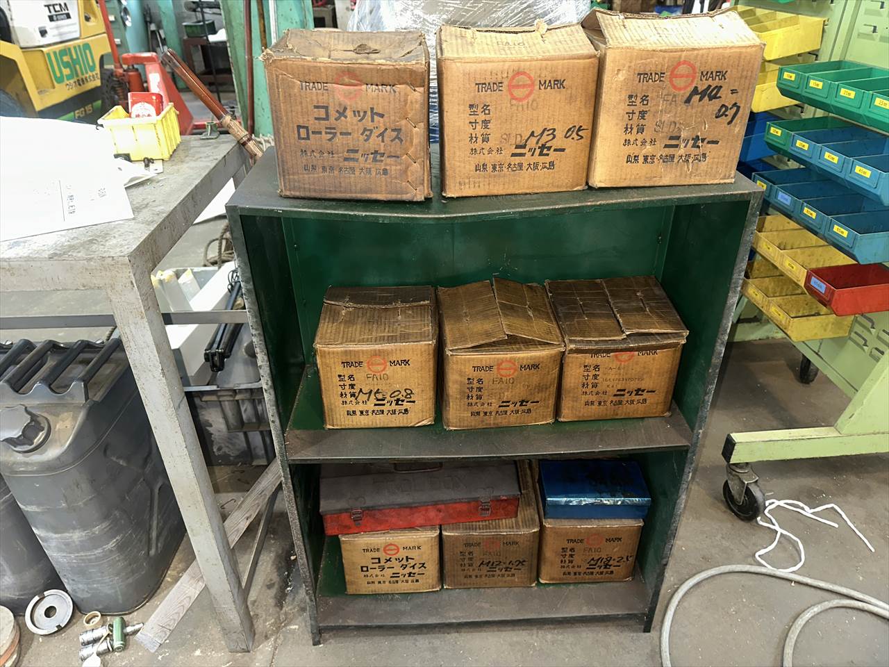 ○転造しうる雄ねじ  最大外径:φ35mm 1+3/8インチ 最少外径:φ3mm 1/8インチ  長さ:75mm ピッチ:0.5~2.5mm 32~10T.P.1 ○ロールダイス  回転数:40、60rpm  最大外径:φ158mm  孔径:φ54mm  幅:40~80mm  主軸間の最大距離:180mm  主軸間の最小距離:125mm(ストッパーなしの時) ○転造力  最大転造圧力  6000㎏ ○モータ  主軸駆動:2.2kw 油圧ポンプ:0.75kw ○機械の大きさ  床面から主軸芯までの高さ:850mm  所要床面積:間口1120×奥行850×高さ1440mm 重量1100㎏ ※ただし、抗張力80㎏/mm2以上の材質の場合には、この項の最大値はとれません。 ○付属品  ダイス  ①ローレットダイス ②M3×0.5(未使用) ③M4×0.7(未使用)  ④M5×0.8(未使用) ⑤M6×1.0 ⑥M8×1.25 ⑦M10×1.5  ⑧M12×1.75(未使用) ⑨M18×2.5(未使用)  支持刃  10-20-30-40-50-80  足踏みスイッチ 専用工具箱
