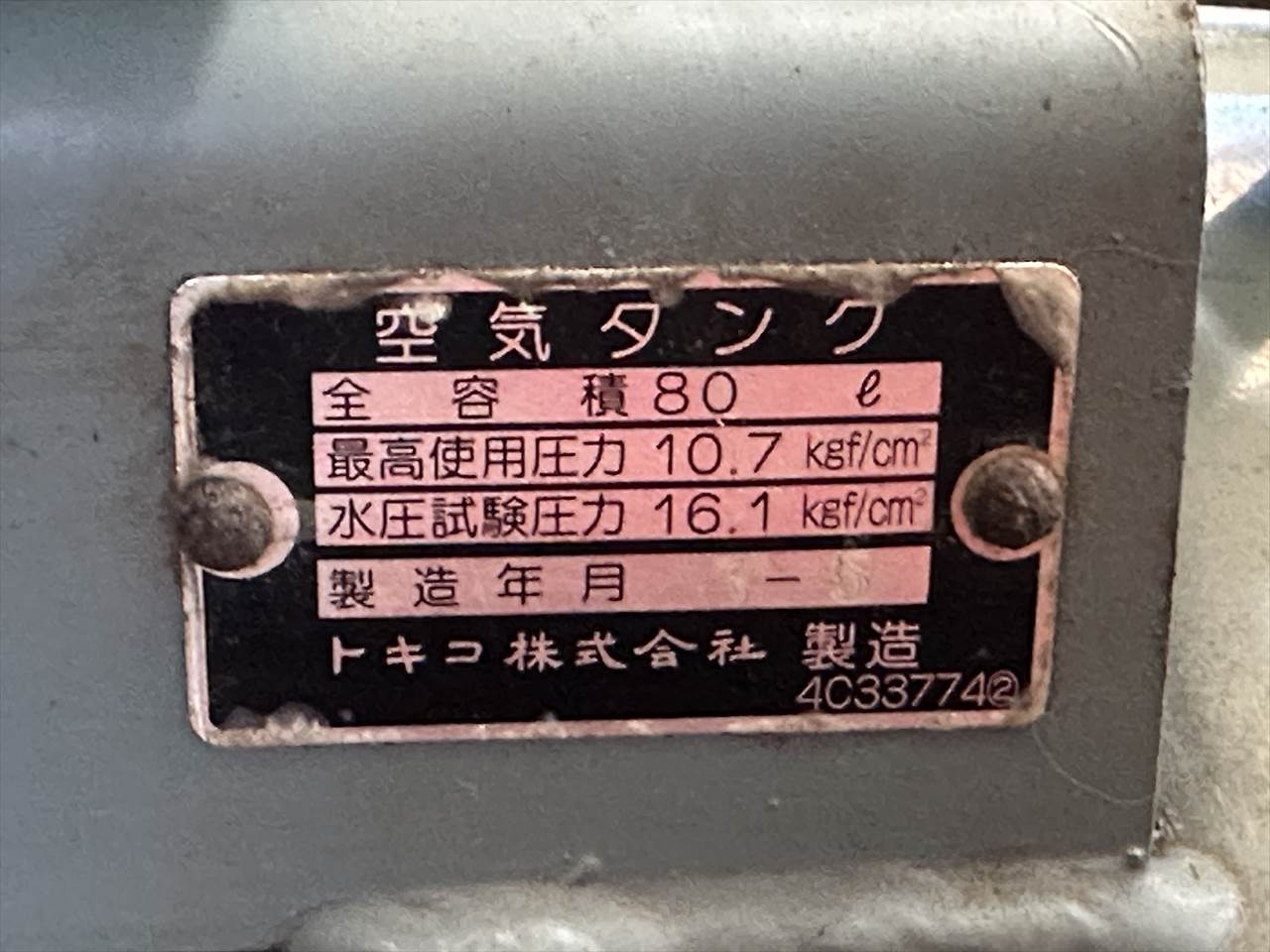 ○特徴  圧力開閉器式 ○最高圧力  0.93MPa 制御圧力ON-OFF:0.74~0.93MPa ○シリンダ径×行程×シリンダ数  φ72×65×2 ○回転速度  730rpm ○吐出し空気量  265L/min ○空気タンク全容量  80L ○電源電圧  三相50Hz200V2.2kw ○機械の大きさ  幅1280×奥行き365×高さ807mm 質量:109㎏ 騒音:72dB